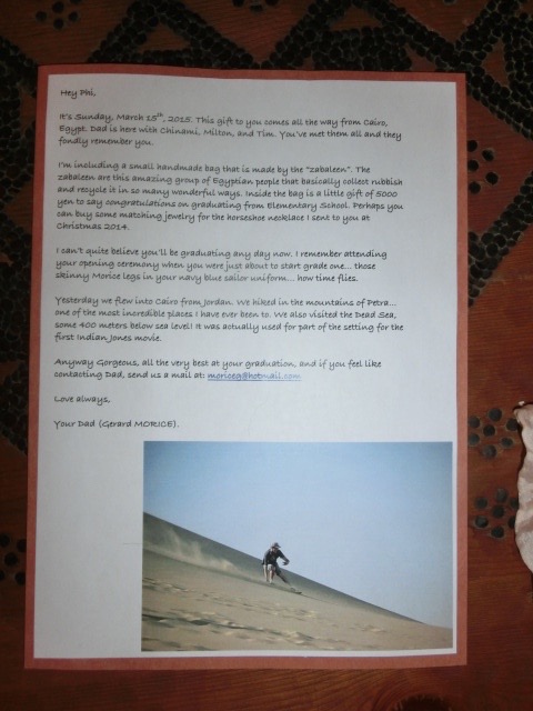 I first met Hayd in G3 at Saint Francis de Sales Primary School. Then Hayd & Dad went on to Aquinas College (year 7 – 12) where we met Tim in year 7. So many adventures together, so many laughs, so many smiles. In May of this year, Hayd joined us in Egypt. He brought his dad and brother with him. Hadyn’s brother is Dad’s namesake – Ged. I’ve known Ged for decades now but hadn’t seen him in years, so it was lovely to catch up. Actually, Ged was your mum & my accountant when we resided in Australia… interesting connection, hey? Together, the Hewitt lads charmed my C. And in March, Tim ventured to Egypt with Milton (from Tokyo) for a few more laughs. We went to Jordan together and Tim made another great mate, in Toro (Toro is still looking forward to meeting you!); Timmy’s quite a canine lover.