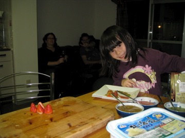 Last Saturday we had a celebration for Toro – his get-out-of-jail party! Tobie & Jin joined us, and Janet came from Lamma Island for a fun night. During the day we did some shopping, and then cooked most of the afternoon. I made sausage rolls (wish you were there to help – my sausage rolls are almost as good as your Pa’s SRs), some chili con carne that I placed in mushrooms and grilled with cheese, and C did her JP karage, a fruit salad, a side salad, and together we put together our own homemade pizza. Loads of food, some good laughs and only one thing missing… you.